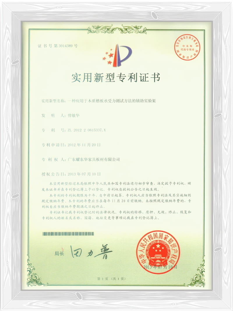 一种应用于木质槽板承受力测试方法的辅助实验架专利证书