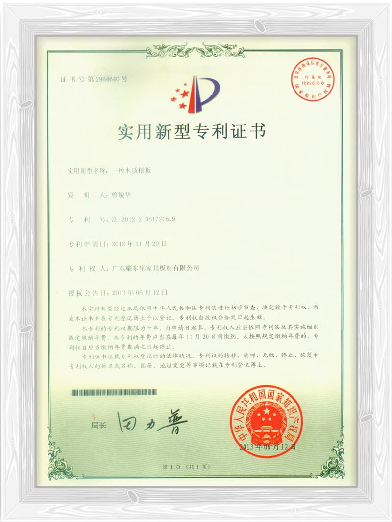 一种木质槽板专利证书
