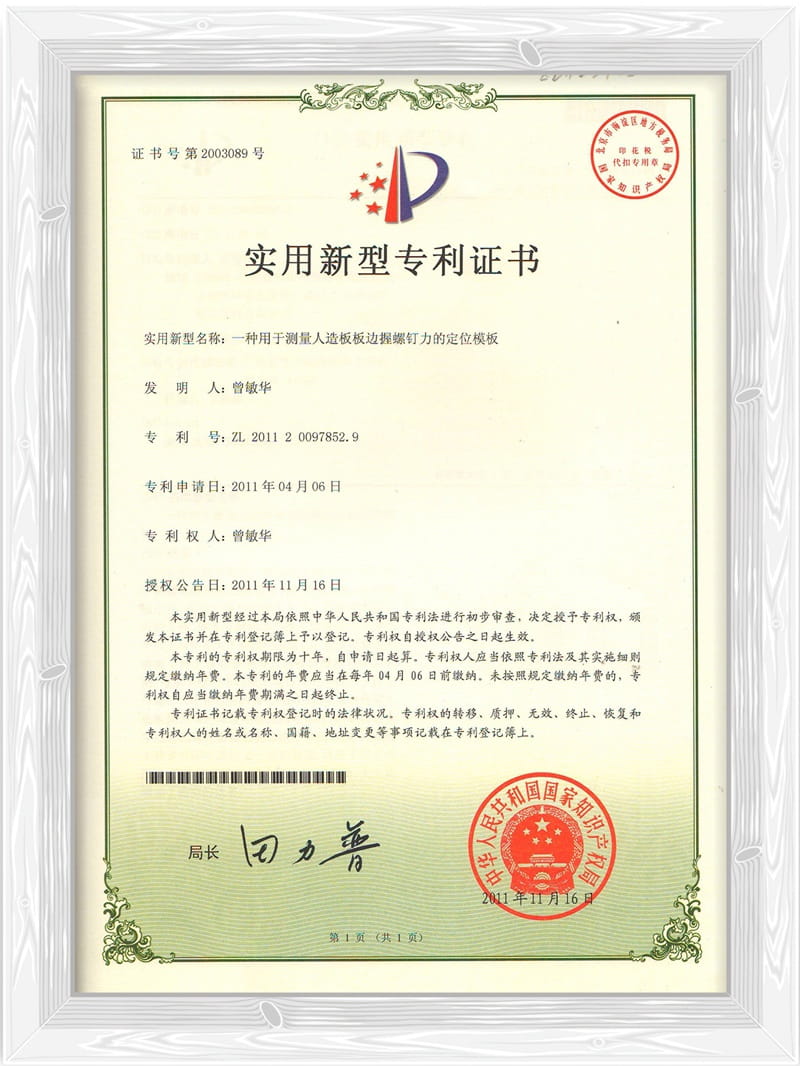 一种用于测量人造板板边握螺钉力的定位模板专利证书