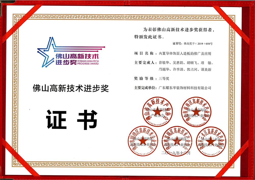 2020年1月8日,在佛山市科技局指导下,由佛山市高新技术产业协会联合各区高新协会共同主办的第二届“佛山高新技术进步奖表彰大会”在佛山中欧中心国际会议中心隆重举行!3377在线公司“内置导体饰面人造板的推广及应用”项目,荣获“佛山高新技术进步奖三等奖”。