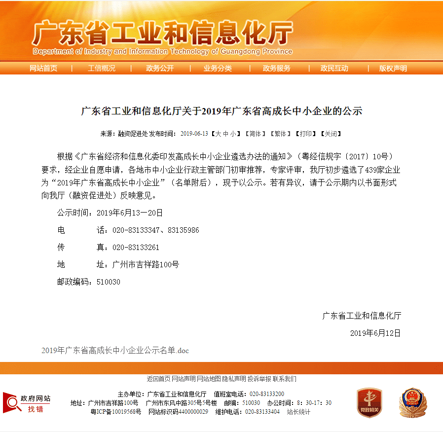 2019年6月13日,经过层层遴选,3377在线公司凭借卓越的自主创新能力、优良的产品和服务、强大的市场竞争力和社会影响力,成功获得“2019年广东省高成长中小企业”称号。